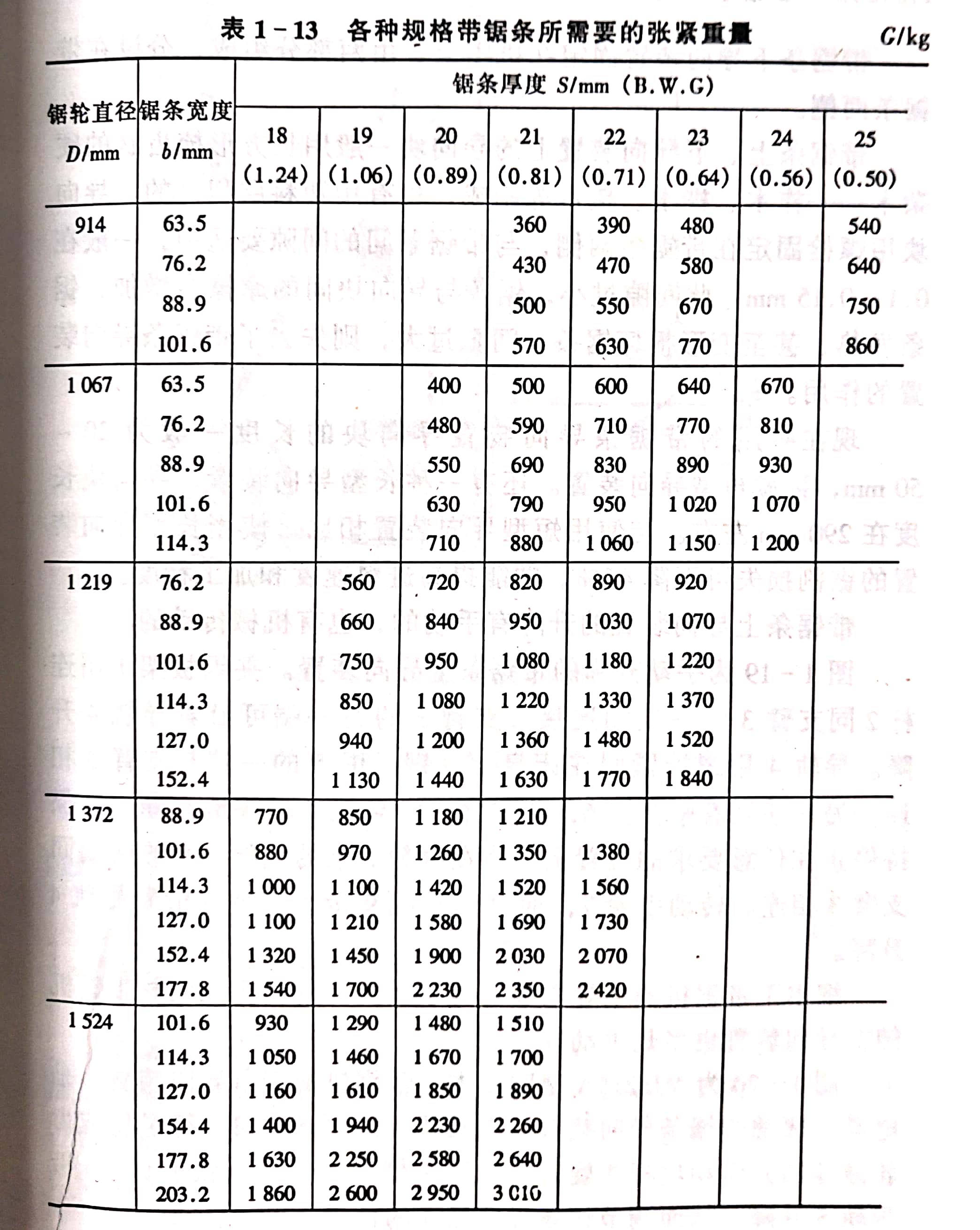 各種規(guī)格帶鋸條所需張緊重量G列入表1-13。