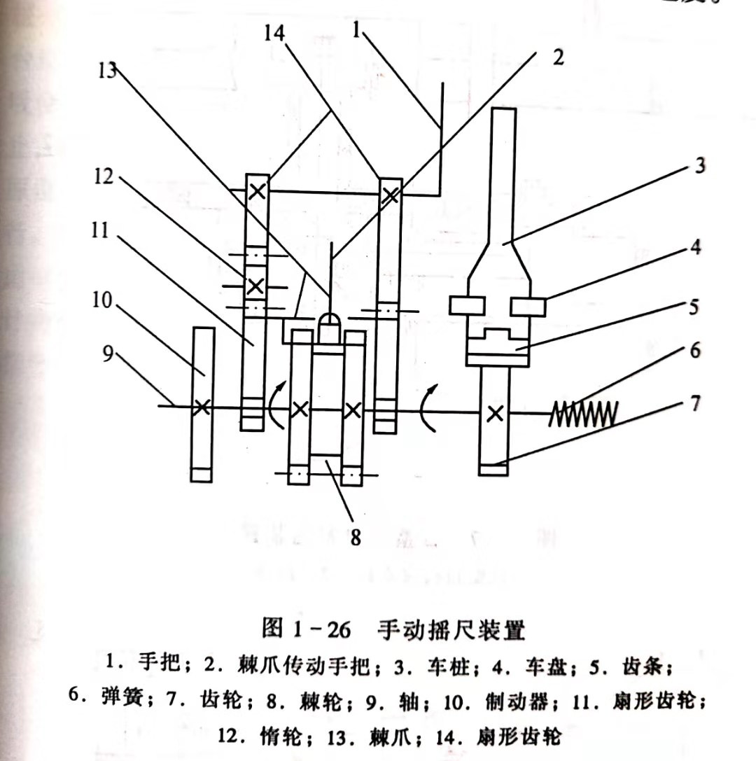 (1)手動搖尺裝置。圖1-26為手動搖尺裝置原理圖。扳動手把1,兩個扇形齒輪14向順(反)時針方向轉(zhuǎn)過一個角度經(jīng)惰輪12,使扇形齒輪11的棘爪13進(jìn)行反(順)時針方向擺動,并使棘輪8進(jìn)行反(順)時針方向轉(zhuǎn)動。通過軸9、齒輪7齒條5,使車樁3移動,達(dá)到原木側(cè)向進(jìn)給的目的。當(dāng)向相反方向扳動手把1時,則右側(cè)棘爪13起作用,并使車樁向同一方向運(yùn)動。所以,只要不斷地前后扳動手把1車樁就可進(jìn)行連續(xù)的進(jìn)給。鋸割完畢后,轉(zhuǎn)動手把2,提起棘爪,在彈簧6的作用下車樁迅速退回。借助制動器10可適當(dāng)?shù)販p緩車樁退回速度。