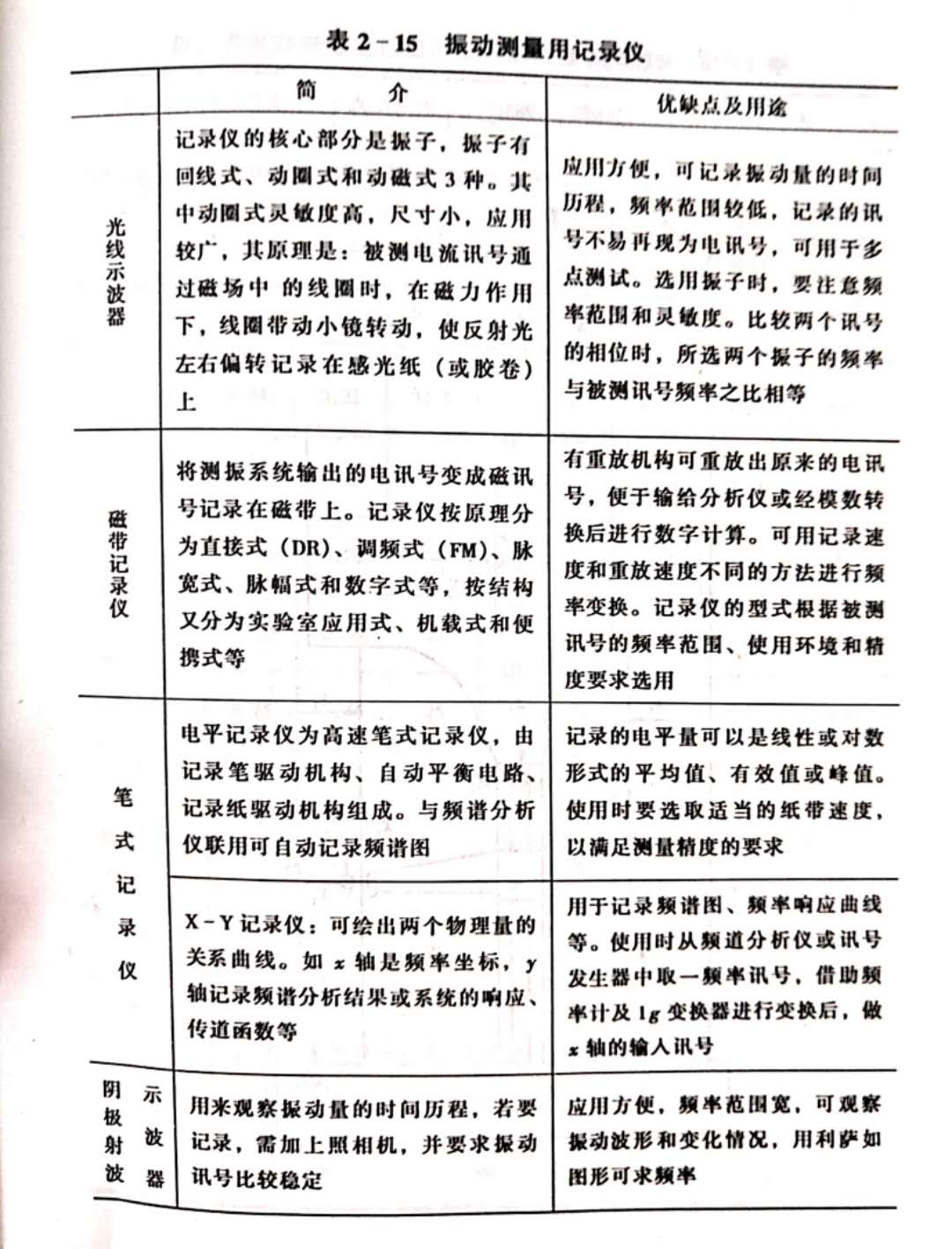 (3)記錄指示器。為了將信號記錄下來,可將信號輸?shù)接涗泝x中,用記錄紙、膠卷或感光紙留下記錄,以便存入檔案。常用的記錄指示器有電平記錄儀、光線示波器、磁帶記錄器等,見表2-15。