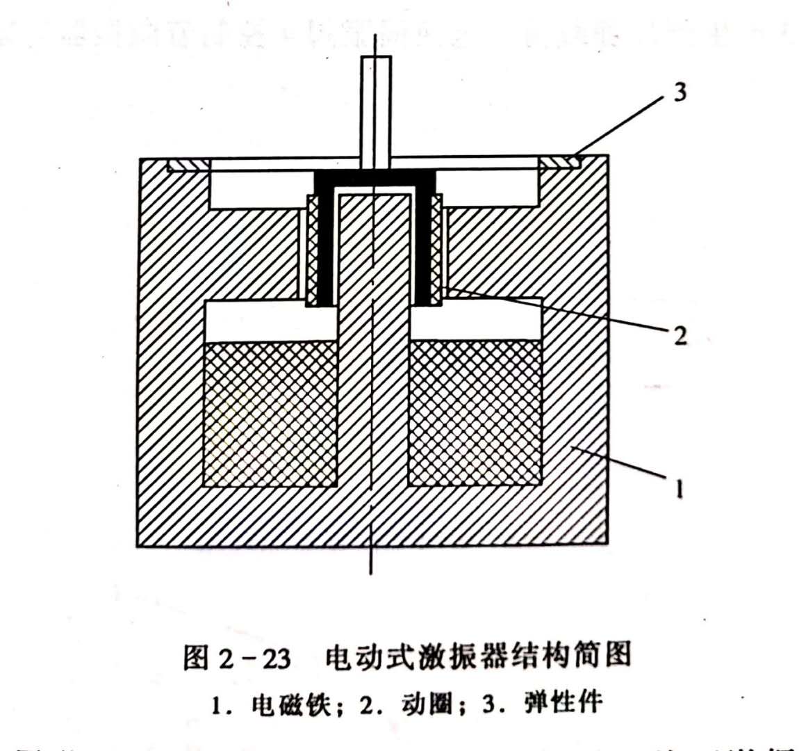 電動式激振器由強力電磁鐵1、動圈2和彈性件3等組成(圖2-23)。動圈2與彈性件3連成一體,并通以各個頻率的交流電流,彈性件3固定在激振器殼體上。振動觸頭與彈性件連成一體而激振被測物體。