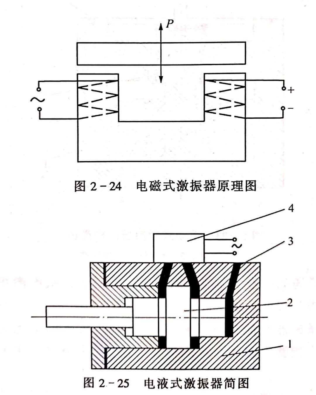 圖2-25為電液式激振器的結(jié)構(gòu)簡圖。1為缸體。電液伺服閥4控制活塞2兩邊油的流向,從而使活塞2振動而實現(xiàn)激振。壓力油3產(chǎn)生預加靜載荷。電液伺服閥4控制著激振器的頻率范圍。