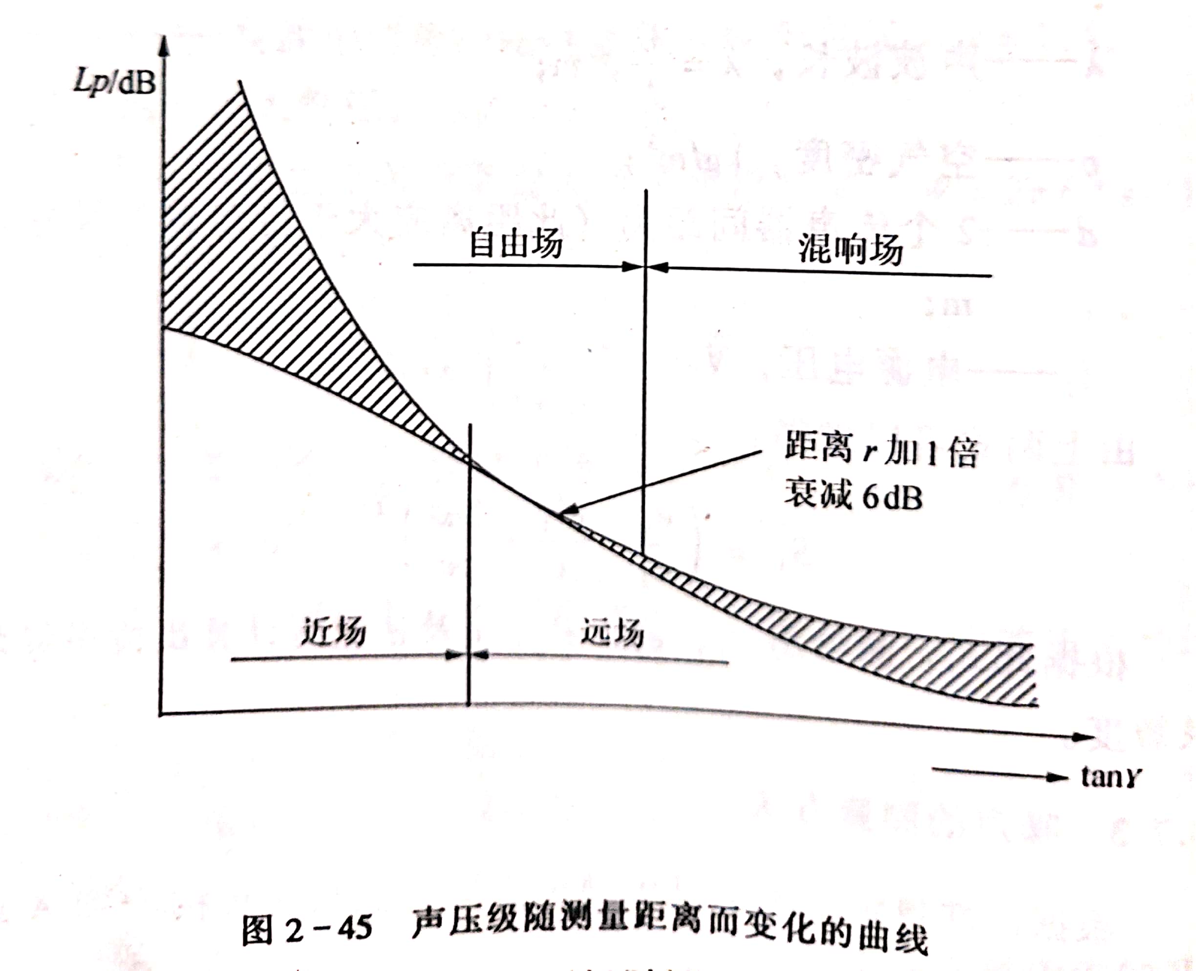 圖2-45陰影部分表示聲壓級(jí)隨測(cè)量距離的變化而波動(dòng)。在自由場(chǎng)的近場(chǎng),測(cè)點(diǎn)靠近聲源,噪聲波動(dòng)大;在混響場(chǎng)中,測(cè)點(diǎn)的聲壓級(jí)隨測(cè)量距離的增加而波動(dòng),均呈不穩(wěn)定聲場(chǎng)。因此,應(yīng)盡可能將測(cè)點(diǎn)選擇在自由場(chǎng)聲場(chǎng)較為穩(wěn)定的遠(yuǎn)場(chǎng)區(qū)域內(nèi)。