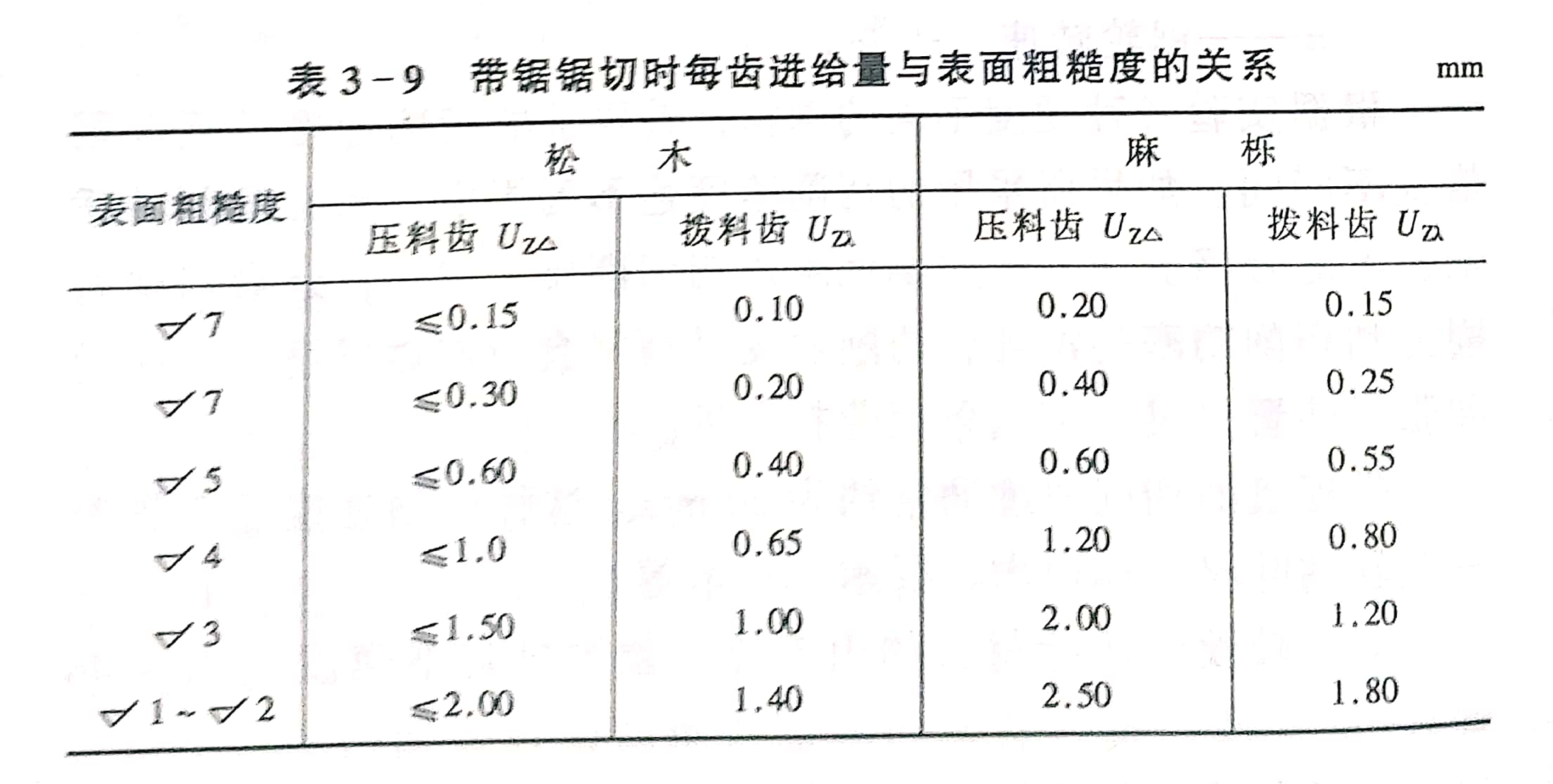 進(jìn)料速度的高低直接影響鋸割質(zhì)量,進(jìn)料速度主要表現(xiàn)在每齒的最大和最小切削量兩個(gè)方面。每齒進(jìn)給量愈小,鋸切質(zhì)量愈高,表3-9列出帶鋸鋸切時(shí)每齒進(jìn)給量與表面粗糙度之間的關(guān)系。