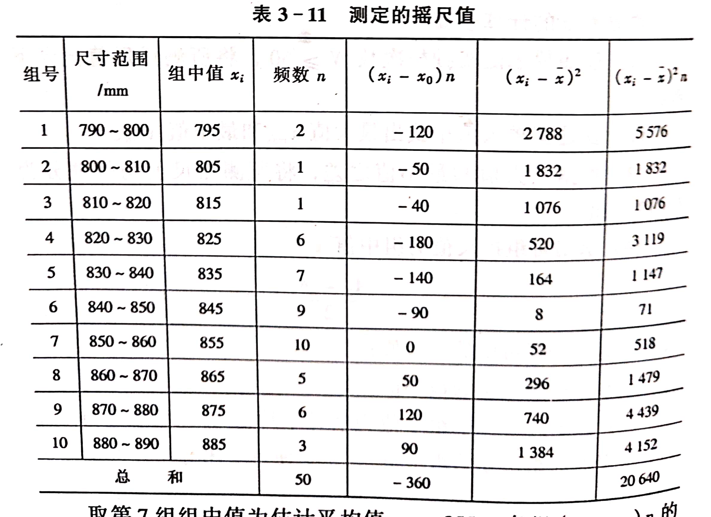 取第7組組中值為估計平均值x0=855,各組(x1-x0)n的總和∑(x1-x0)n=-360,計算公差中心: