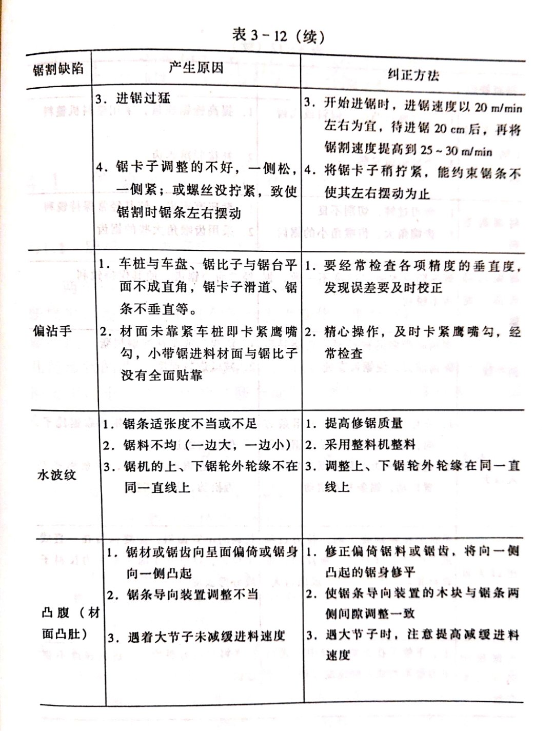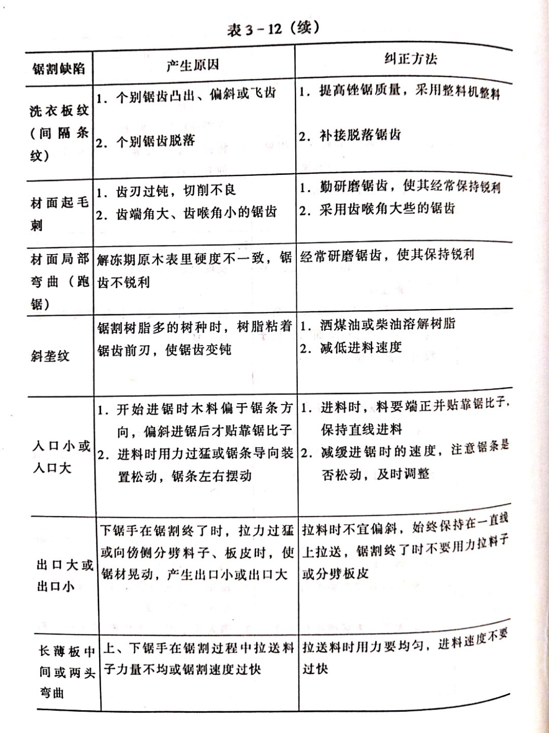 在鋸割過程中,常常由于對鋸機(jī)缺乏基本知識(shí)的理解,技術(shù)水平較低,會(huì)造成一些不應(yīng)出現(xiàn)的故障,這些故障會(huì)影響生產(chǎn)降低鋸割質(zhì)量。帶鋸機(jī)故障對鋸割質(zhì)量的影響列入表3-12。