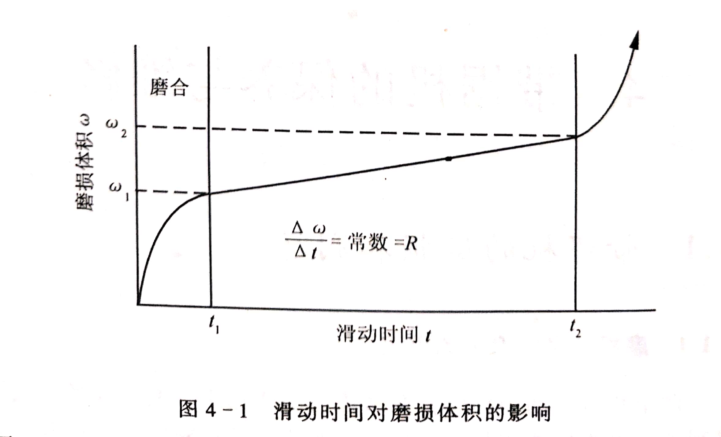 兩個(gè)相對(duì)運(yùn)動(dòng)的物體,在摩擦力的作用下,其表面的物質(zhì)不斷損失,表面尺寸和幾何形狀發(fā)生變化,重量減輕,這種現(xiàn)象叫做磨損。例如,長(zhǎng)期使用過(guò)的鋸輪表面層尺寸的減少,升降導(dǎo)軌幾何形狀的改變,這些現(xiàn)象都是磨損。磨損常以磨損率來(lái)表示,磨損率可定義為經(jīng)初始“磨合期”后磨損體積的變化率R(圖4-1)。磨損率可用下式求得