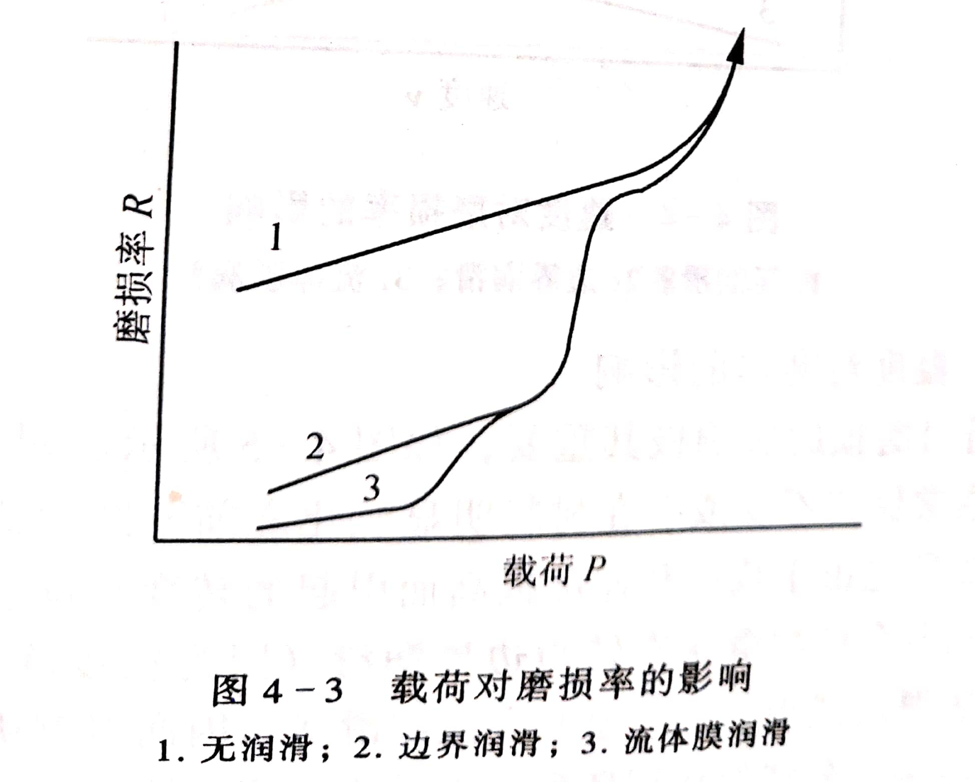 隨著載荷(圖4-3)的提高,無(wú)潤(rùn)滑的磨損率也將提高。最后達(dá)到磨損率急劇提高的一點(diǎn)。這種提高通常是由于產(chǎn)生的高溫使材料軟化或者是由于防止表面損傷和磨損的表面膜(通常為氧化膜)破裂所致。當(dāng)載荷提高到它使溫度升高(和潤(rùn)滑劑失效)時(shí),或者載荷過(guò)高而使變形磨損加劇時(shí),邊界潤(rùn)滑的磨損率不斷提高或保持不變。在非常低的速度下,提高載荷最后使材料在接觸處發(fā)生變形。流體膜潤(rùn)滑的磨損率很低或可忽略不計(jì),除非載荷足夠高,以致油膜厚度減小而轉(zhuǎn)為邊界潤(rùn)滑。