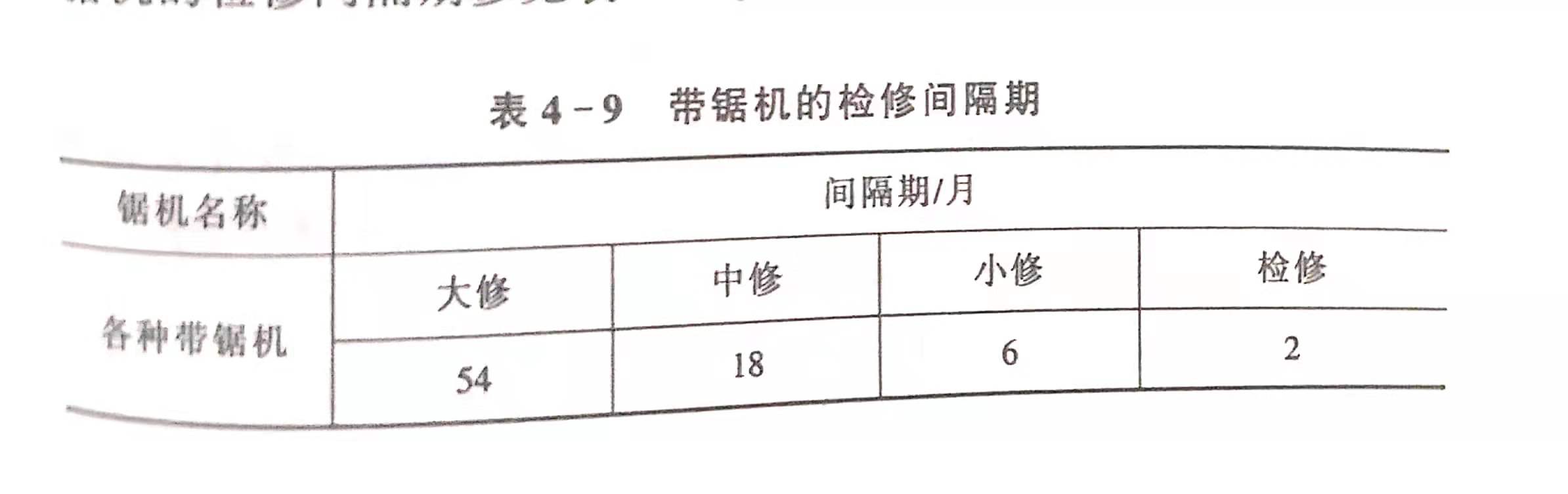 修理間隔期是設(shè)備2次相鄰的計(jì)劃修理之間的間隔時(shí)間,帶鋸機(jī)的檢修間隔期參見表4-9。