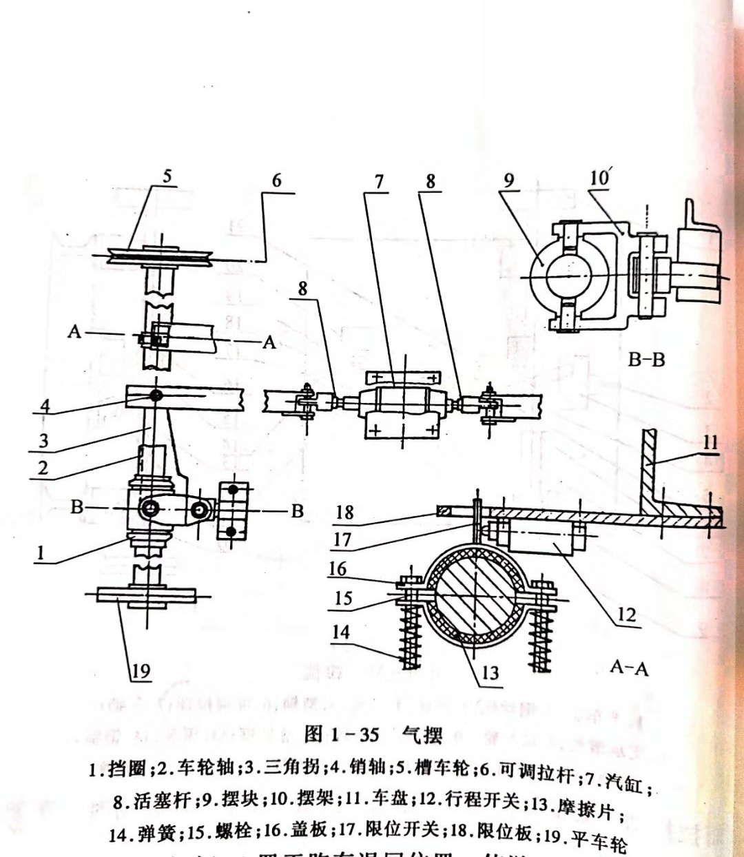 (4)氣擺。這種車擺的基本原理是通過氣缸、活塞推動拉桿帶動車架橫向移動。圖1-35氣擺為信陽木工機(jī)械廠生產(chǎn)的MJ3212型跑車木工帶鋸機(jī)上所采用的車擺的結(jié)構(gòu)圖。