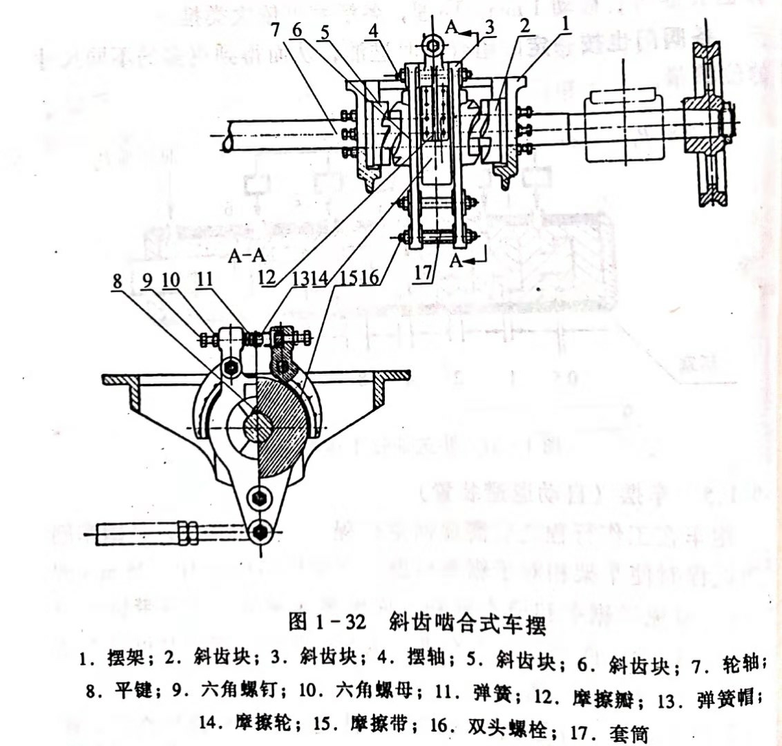 (1)斜齒嚙合式車擺。這種車擺又稱暗擺,是由斜面推力實現(xiàn)車架擺動的。圖1-32為斜齒嚙合式車擺的結(jié)構(gòu)圖。