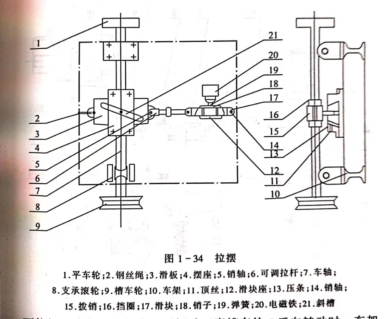 (3)拉擺。拉擺是以鋼絲繩拉動滑板使車架橫向移動的裝置,如圖1-34所示。